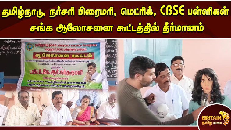 தமிழ்நாடு, நர்சரி பிரைமரி, மெட்ரிக், CBSE பள்ளிகள் சங்கம், தமிழ்நாடு இளம் மழலையர் பள்ளிகள் சங்கம், மதுரை இளம் மழலையர் பள்ளி சங்கங்கள் இனைந்து இன்று ஆலோசனை பொதுகூட்டம் மதுரை மீனாட்சி பஜார் அருகே உள்ள லேபர் பள்ளியில் நடைப்பெற்றது.