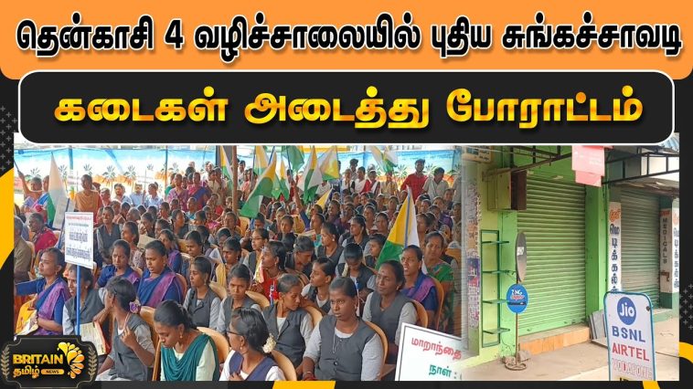 தென்காசி 4 வழிச்சாலையில் சுங்கச்சாவடி அமைக்கும் பணியை கைவிட வலியுறுத்தி 500க்கும் மேற்பட்ட கடைகள் அடைத்து, ஆயிரத்திற்கும் மேற்பட்டோர் போராட்டத்தில் ஈடுபட்டனர்