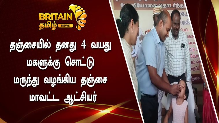தஞ்சையில் தனது 4 வயது மகளுக்கு சொட்டு மருந்து வழங்கிய தஞ்சை மாவட்ட ஆட்சியர்