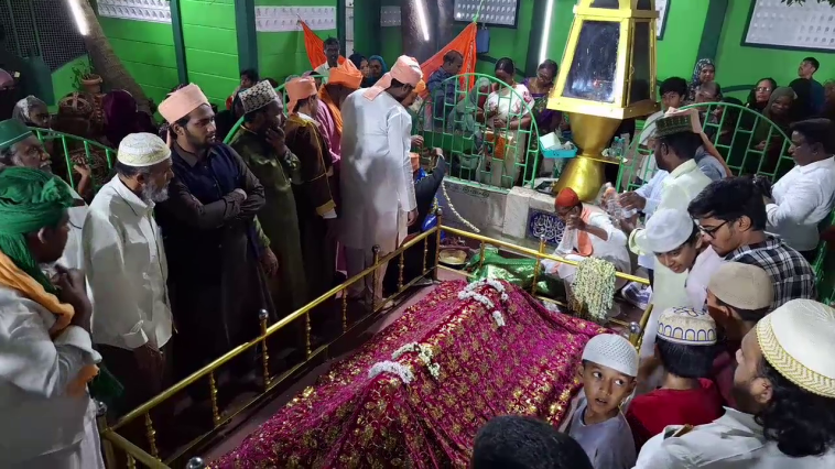 பின்னர் பாத்தியா ஓதப்பட்டு அங்குள்ள சமாதிக்கு சந்தனம் பூசும் நிகழ்ச்சி நடைபெற்றது. இதைத்தொடர்ந்து அந்த இடத்தில் மலர் போர்வை போர்த்தி வழிபாடு நடந்தது.