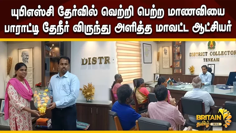 தென்காசி மாவட்டம் செங்கோட்டையை சேர்ந்த மாணவி இன்பா யுபிஎஸ்சி தேர்வில் வெற்றி பெற்ற நிலையில் மாவட்ட ஆட்சியர் அவரை நேரடியாக அழைத்து பூங்கொத்து கொடுத்து பாராட்டியதுடன் தேநீர் விருந்து அளித்து நெகிழ்ச்சியை ஏற்படுத்தி உள்ளார்