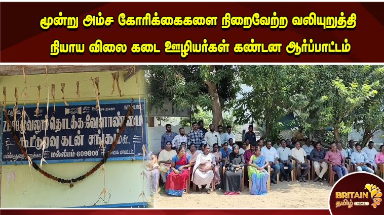 மூன்று அம்ச கோரிக்கைகளை நிறைவேற்ற வலியுறுத்தி நியாய விலை கடை ஊழியர்கள் கண்டன ஆர்ப்பாட்டம்