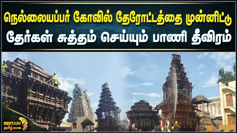 வரும் 13ஆம் தேதி தேரோட்ட திருவிழா கொடியேற்றத்துடன் தொடங்கி 10 நாட்கள் நடைபெறுகிறது. 21 ஆம் தேதி தேரோட்டம் நடைபெறும் சூழலில் நெல்லை பேட்டை தீயணைப்பு துறையினர் சுவாமி நெல்லையப்பர் திருக்கோவில் குடவரை வாயில் மண்டபத்தில் அமைந்துள்ள மர சிற்பங்கள் சுவாமி நெல்லையப்பர் காந்திமதி அம்பாள் விநாயகர் சுப்பிரமணியர் சண்டிகேஸ்வரர் திருத்தேர்களை தீயணைப்பு துறை வாகனத்தின் மூலம் சுமார் 13,500 லிட்டர் தண்ணீர் கொண்டு நவீன மோட்டார்கள் மூலம் தண்ணீரை பீச்சி அடித்து சுத்தம் செய்தனர்.