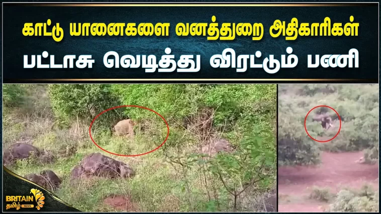 யானைகளை பட்டாசு வெடித்து காட்டுக்குள் அனுப்பும் பணியை வனத்துறையினர் மேற்கொண்டு வருகின்றனர்