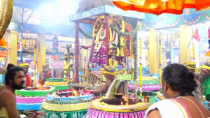 இன்று அதிகாலை நான்காம் காலை யாகசாலை பூஜைகள் நடைபெற்றது தொடர்ந்து நான்கு கால யாக வேள்விகளில் பூஜை செய்யப்பட்ட மகா கலசத்திற்கு மகாதீபாரதனை செய்யப்பட்டு மேளதாளம் முழங்க ஊர்வலமாக எடுத்து வரப்பட்டது.