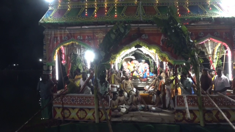 விழாவை முன்னிட்டு வண்ண மின்னொளியில் தெப்பத்தில் வலம் வந்த பெருமாளை பக்தர்கள் ஏராளமானோர் தரிசனம் செய்தனர்