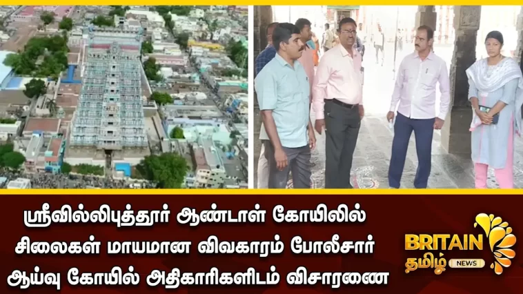 ஸ்ரீவில்லிபுத்தூர் ஸ்ரீ ஆண்டாள் கோவில் கொடிமரம் மற்றும் சிலைகள் காணவில்லை என நிர்வாக அதிகாரி புகார் அடிப்படையில் இன்று திடீர் சிலை கடத்தல் பிரிவு துணை கண்காணிப்பாளர் மற்றும் போலீசார் ஆய்வு மேற்கொண்டு வருகிறார்.