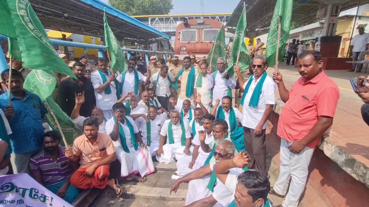 தஞ்சை ரயில் நிலையத்தில் திருச்சி காரைக்கால் பாசஞ்சர் ரயிலை மறித்து தண்டவாளத்தில் அமர்ந்து போராட்டத்தில் ஈடுபட்ட பி ஆர் பாண்டியன் உள்ளிட்ட நூற்றுக்கு மேற்பட்ட விவசாயிகளை காவல்துறையினர் கைது செய்தனர்