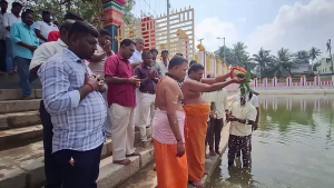 பின்னர் கோயிலின் குளத்திற்கு சென்று அங்கு தீபாராதனை காண்பித்து குளத்தில் புனித நீர் ஊற்றப்பட்டது. இந்நிகழ்ச்சியில் கோயில் செயல் அலுவலர் நரசிங்கபெருமாள், அறநிலையத்துறை ஆய்வாளர் சீனிவாசன், கவுன்சிலர்கள் ஜெயசித்ரா பாலசுப்பிரமணியன், மணிகண்டன், ஒப்பந்ததாரர் சண்முகசுந்தரம் உள்ளிட்ட பலர் பங்கேற்றனர்.