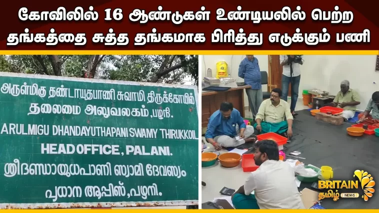 பழனி முருகன் கோவிலில் 16 ஆண்டுகள் உண்டியலில் பெற்ற தங்கத்தை சுத்த தங்கமாக பிரித்து எடுக்கும் பணி நடைபெற்று வருகிறது.