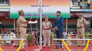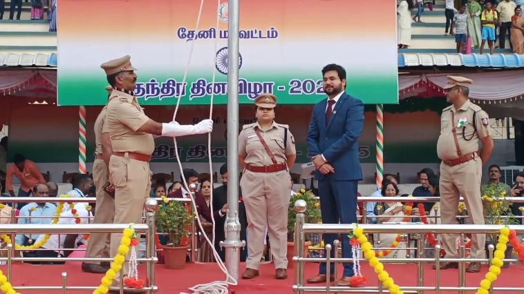 தேனி மாவட்ட ஆட்சியர் ரஞ்சித் சிங் மூவர்ண கொடியினை ஏற்றி மரியாதை
