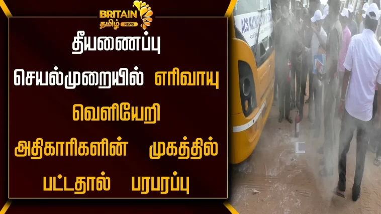 அப்போது திடிரென அவசர தீயணைப்பான் உள்ள எரிவாயு வெளியேறி அதிகாரிகள் முகத்தில் விழுந்ததால் அதிகாரிகள் சிலர் சற்று தூரம் ஓட்டம் பிடித்தனர்.