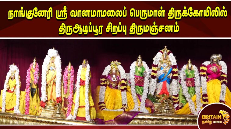 நாங்குனோி ஸ்ரீ வானமாமலைப் பெருமாள் திருக்கோயிலில் திருஆடிப்பூரத்தை முன்னிட்டு சுவாமி தெய்வநாயகன் ஸ்ரீவரமங்கை ஸ்ரீ ஆண்டாள் ஆகியோருக்கு சிறப்பு திருமஞ்சனம் நடைபெற்றது.