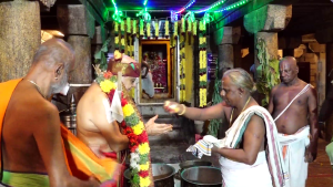 தொடா்ந்து ஜீயா் சுவாமிகள் ஆசீா்வதிக்க துளசி பிச்சி முல்லை பச்சை ரோஜா மல்லி தாமரை செவ்வரளி போன்ற வாசனை பூக்களால் புஷ்பாஞ்சலி நடைபெற்றது. அத்யாபககோஷ்டியினா் பஞ்ச சுக்தம் பாடினா். ஜீயா் சுவாமிகளுக்கு பாிவட்டம் கட்டி மாலை அணிவித்து அா்ச்சனை குங்குமம் பூக்கள் வழங்கப்பட்டது.