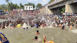 அதே சமயத்தில், காவிரி நதியில் திரண்டு இருந்த ஆயிரக்கணக்கானோர் புனித நீராடினர் தொடர்ந்து பஞ்சமூர்த்திகளுக்கும், மகா தீபாராதனை செய்யப்பட்டது, இதனையடுத்து ஆயிரக்கணக்காண பக்தர்கள் கரையில் எழுந்தருளிய சுவாமிகளை தரிசனம் செய்து மகிழ்ந்தனர்.