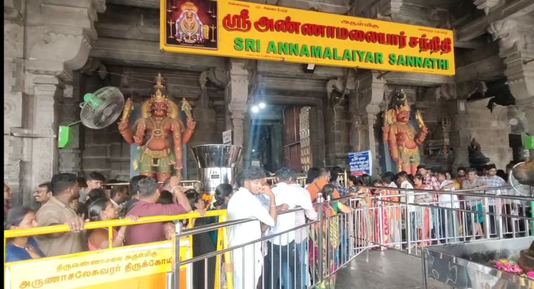ஞாயிற்றுக்கிழமை விடுமுறையொட்டி அண்ணாமலையார் திருக்கோயிலில் அதிகாலை முதல் ஆயிரக்கணக்கான பக்தர்கள் நீண்ட வரிசையில் 3 மணி நேரத்திற்கு மேலாக காத்திருந்து சுவாமி தரிசனம்.