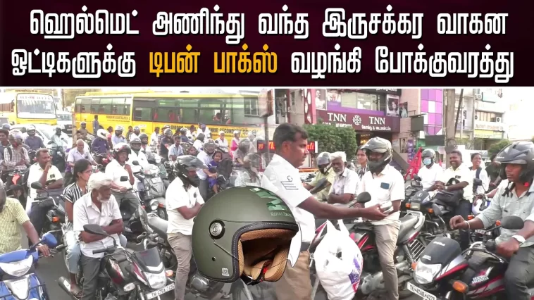 மேலும், ஹெல்மெட் அணிந்து வந்த இருசக்கர வாகன ஓட்டிகளுக்கு டிபன் பாக்ஸ்களை பரிசாக வழங்கி விழிப்புணர்வு ஏற்படுத்தினர்.