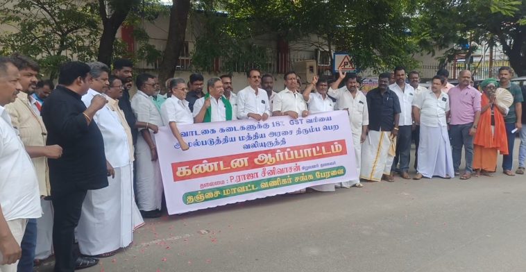 தஞ்சை மாவட்ட வணிகர் சங்க பேரவை சார்பில் தஞ்சாவூர் தலைமை தபால் நிலையம் முன்பு மத்திய அரசை கண்டித்து கண்டன ஆர்ப்பாட்டம் நடைபெற்றது, இந்த ஆர்ப்பாட்டத்தில் மத்திய அரசு சார்பில், வசூலிக்கப்படும் கடை வாடகைக்கு 18 சதவீதம் ஜிஎஸ்டி வரிவிதிப்பை ரத்து செய்ய வலியுறுத்தி மத்திய அரசுக்கு எதிராக கண்டன கோஷம் எழுப்பி ஆர்ப்பாட்டத்தில் வணிகர்கள் ஈடுபட்டனர், இந்த வரி விதிப்பு கார்ப்பரேட் நிறுவனங்களுக்கு சலுகை அளிப்பதற்காகவே திட்டமிட்டு உருவாக்கப்பட்டுள்ளது, இதனால் சிறு வணிகர்கள் பாதிக்கப்படுவார்கள் என்றும் மத்திய அரசு வியாபாரிகளை சுரண்டுவதற்கு மாநில அரசு அனுமதிக்க கூடாது, தமிழக அரசு இது குறித்து தெளிவுபடுத்த வேண்டும் என்றும் கோரிக்கை வைக்கின்றனர், இந்த ஆர்ப்பாட்டத்தில் உள்ள வணிகர்கள் ஏராளமானோர் கலந்து கொண்டனர்