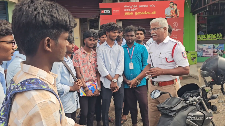 இந்நிலையில் கல்லூரி செல்லும் மாணவர்கள் போக்குவரத்து விதிகளை மீறி பேருந்துகளில் படியில் தொங்கியவாரும் இருசக்கர வாகனங்களில் ஆபத்தை உணராமல் மாணவர்கள் செய்வது தொடர் கதையாக இருந்து வந்த நிலையில்