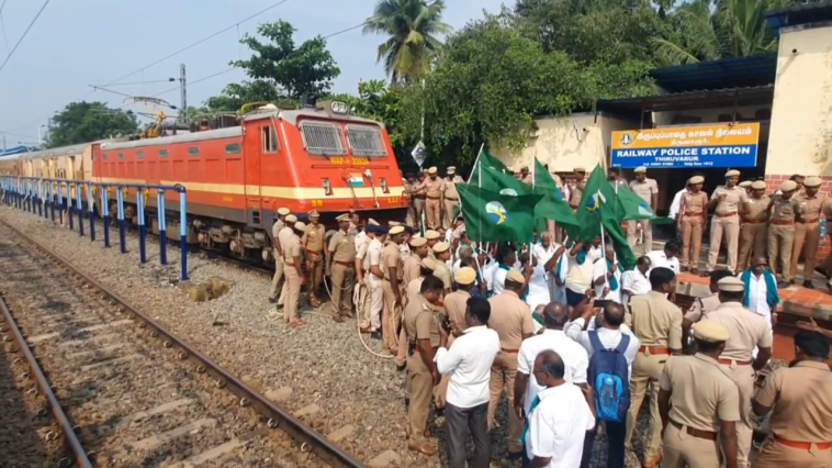 தமிழக காவிரி விவசாயிகள் சங்க திருவாரூர் மாவட்ட தலைவர் சுப்பையின் தலைமையில் திருவாரூர் புதிய ரயில்வே நிலையத்தில் ரயில் மறியல் போராட்டம் நடைபெற்றது.