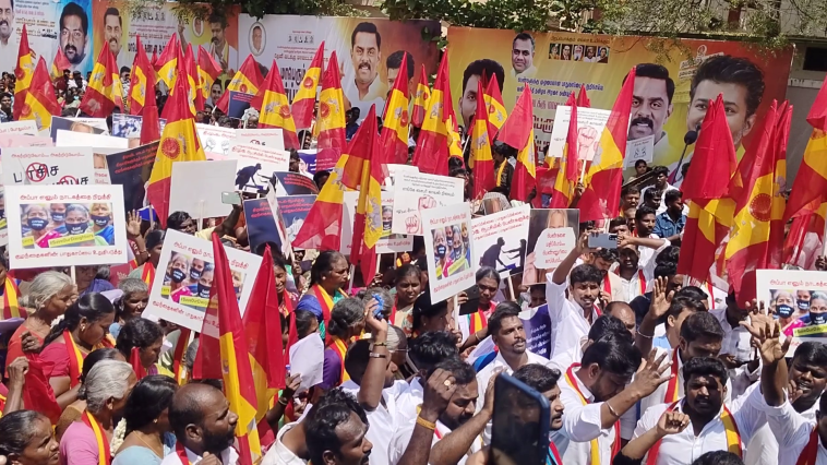 பெண்களுக்கு எதிரான குற்றங்களை தடுக்க தமிழக வெற்றி கழகம் சார்பில் மாபெரும் கண்டன ஆர்ப்பாட்டம்