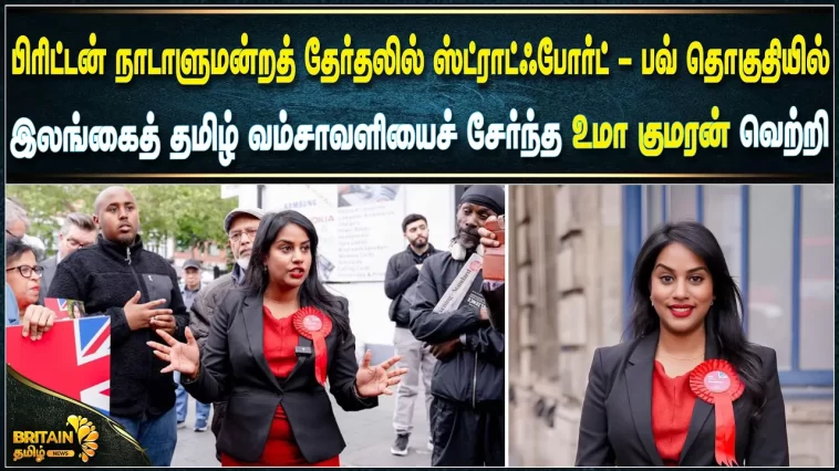 பிரிட்டன் நாடாளுமன்றத் தேர்தலில் ஸ்ட்ராட்ஃபோர்ட் – பவ் தொகுதியில் இலங்கைத் தமிழ் வம்சாவளியைச் சேர்ந்த உமா குமரன் தொழிலாளர் கட்சி சார்பில் வெற்றி பெற்றுள்ளார். தொழிலாளர் கட்சி 14 ஆண்டுகளுக்கு பிறகு ஆட்சி அமைக்க உள்ளது.