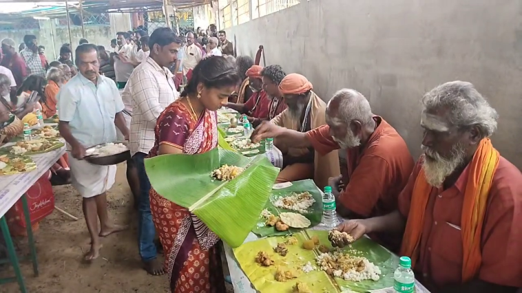 குத்தாலம் அருகே உறிகட்டி சித்தர் 118 ஆம் ஆண்டு குருபூஜை ஆராதனை, குழந்தை வரம் வேண்டி சாதுக்களிடம் மடிப் பிச்சை உணவு வாங்கி தம்பதிகள் வினோத வழிபாடு.