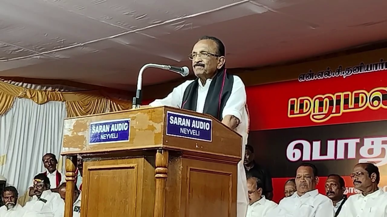 வட மாநில தொழிலாளர்களை என்எல்சி நிறுவனத்தில் பணியில் அமர்த்துவதை அடியோடு நிறுத்த வேண்டும் நெய்வேலியில் நடைபெற்ற மதிமுக பொதுக்கூட்டத்தில் வைகோ பேச்சு