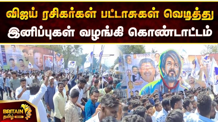 விஜய் ரசிகர்கள் பட்டாசுகள் வெடித்து இனிப்புகள் வழங்கி கொண்டாட்டம்