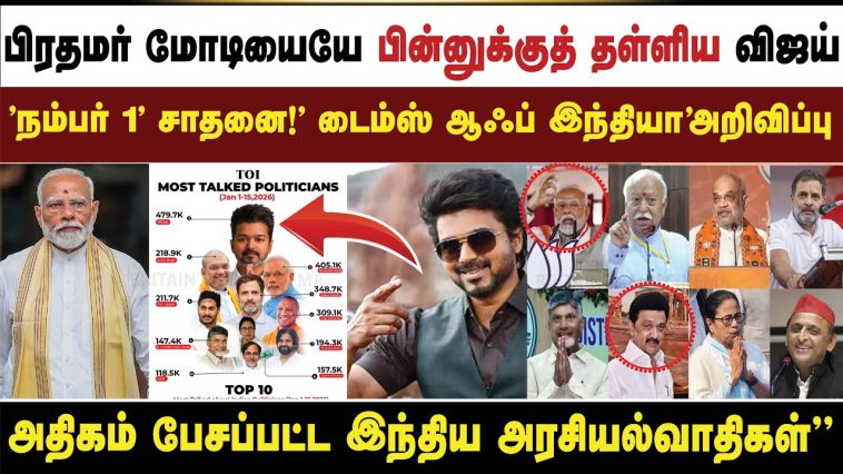 இவ்வளவு பிரச்சனைகளுக்கு மத்தியிலும் விஜய்க்கு ஒரு செம பெருமை கிடைச்சிருக்கு. ‘டைம்ஸ் ஆஃப் இந்தியா’ வெளியிட்ட “அதிகம் பேசப்பட்ட இந்திய அரசியல்வாதிகள்” (Most Talked About Indian Politicians) பட்டியல்ல, பிரதமர் மோடியையே பின்னுக்குத் தள்ளி விஜய் முதலிடம் பிடிச்சிருக்காரு!