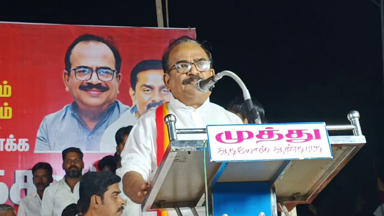 தேனி வடக்கு மாவட்ட தமிழக வெற்றி கழகம் சார்பில் கொள்கை விளக்க பொதுக்கூட்டம் தேனி பங்களாமேடு பகுதியில் நடைபெற்றது இதில் த.வெ.க பரப்புரை செயலாளர் நாஞ்சில் சம்பத் கலந்து கொண்டு சிறப்புரையாற்றினார். விழா மேடையில் பேசி நாஞ்சில் சம்பத் கூறுகையில்