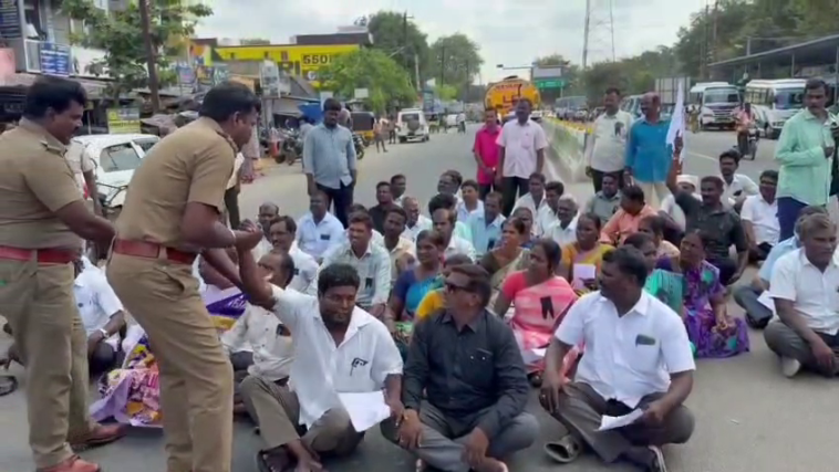 சாலை மறியலில் ஈடுபட்ட கிராம உதவியாளர்களை செஞ்சி காவல்துறையினர் கைது செய்து பேருந்தில் ஏற்றி தனியார் திருமண மண்டபத்தில் அடைத்து வைத்துள்ளனர்.