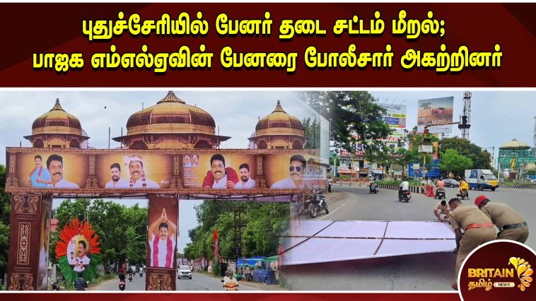 புதுச்சேரியில் பேனர் தடை சட்டம் மீறல்; பாஜக எம்எல்ஏவின் பேனரை போலீசார் அகற்றினர்- பாஜக பிரமுகர் மீது வழக்குபதிவு.
