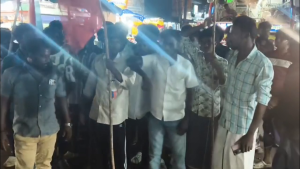 அப்போது விசிக தொண்டர் ஒருவர் சட்டை பையில் மறைத்து வைத்திருந்த சிறிய டப்பாவில் வைத்திருந்த மண்ணெண்ணெய்யை மேலே ஊற்றி கொண்டு தீ குளிக்க முயன்றார் அவரை போலீசார் தடுத்து அழைத்து சென்றனர்.