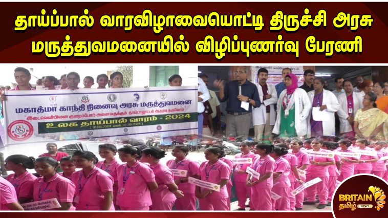 தாய்ப்பால் வாரவிழாவையொட்டி திருச்சி அண்ணல்காந்தி அரசு தலைமை மருத்துவமனையில் “இடைவெளியை குறைப்போம் – தாய்ப்பால் ஊட்டுதலை ஊக்கப்படுத்துவோம்” என்ற கருப்பொருளை மையமாகக் கொண்டு, தாய்ப்பாலை கொடுப்போம் தலைமுறையைக் காப்போம் மற்றும் மார்பக புற்றுநோயிலிருந்து பெண்களை காப்போம் மற்றும் தாப்பாலின் அவசியம் குறித்த உறுதிமொழியினையும் மருத்துவர்கள், செவிலியர்கள், ரோட்டரி மற்றும் லயன்ஸ் சங்கத்தினர், தாய்மார்கள் ஏற்றுக்கொண்டனர்.