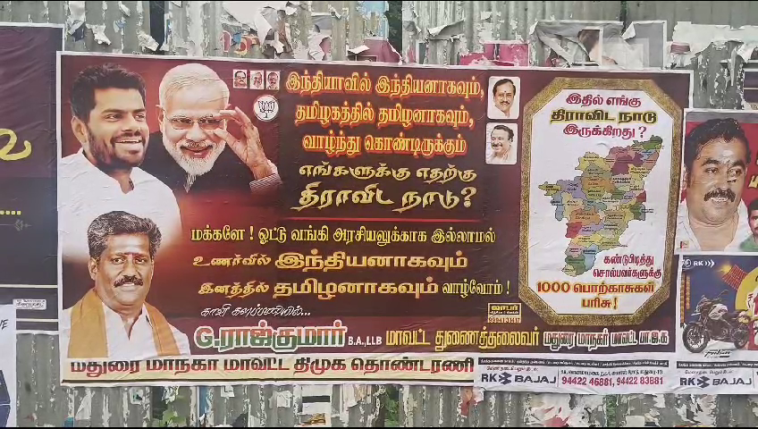 இந்திய வரைபடத்தில் திராவிட நாடு எங்கே இருக்கிறது கண்டுபிடித்து சொல்பவர்களுக்கு ஆயிரம் பொற்காசுகள் பரிசு மதுரையில் பாஜகவினர் ஒட்டிய போஸ்டர்