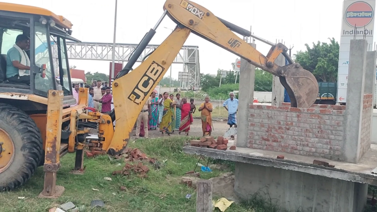சிதம்பரம் நான் முனிசிபல் தெற்கு அம்மன் கோவில் கிராம பகுதியில் சுமார் 100க்கும் மேற்பட்ட குடும்பத்தினர் வசித்து வரும் நிலையில் அந்த பகுதியில் 2 தலைமுறைகளாக சுமார் 60 ஆண்டுகளுக்கு மேல் அம்மன் கோவில் ஒன்று உள்ளது, தற்போது விழுப்புரம் நாகை தேசிய நெடுஞ்சாலை விரிவாக்கம் செய்யப்பட்ட நிலையிலும் கோவிலுக்கு எந்த ஒரு பாதிப்பும் இல்லாத இருந்தது ஆனால் தற்போது கோவில் இருக்கும் இடம் நெடுஞ்சாலைக்கு சொந்தமானது என நெடுஞ்சாலை துறை அதிகாரிகள் போலீசார் பாதுகாப்புடன் ஜேசிபி வாகனத்துடன் புதிதாக கட்டப்பட்டு வந்த கோவிலை இடித்து தள்ளினர், அப்போது அங்கு கூடியிருந்த கிராம பொதுமக்கள் கோவிலை இடிப்பதை பார்த்து கண்ணீர் விட்டு அழுததுடன் மண்ணை எடுத்து அதிகாரிகள் மற்றும் போலீசார் மீது வீசி விட்டு சாபம் விட்ட சம்பவம் பெரும் பரபரப்பை ஏற்படுத்தியது.